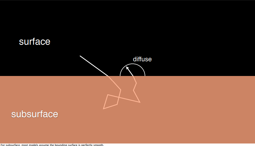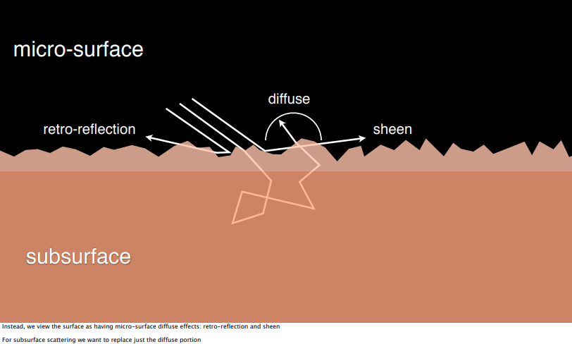 光线照射到粗糙物体之上后,在表面先形成retro-reflection和sheen两种反射,然后进入物体内部,在其中不断弹射形成subsurface,弹射出的光线形成diffuse。
